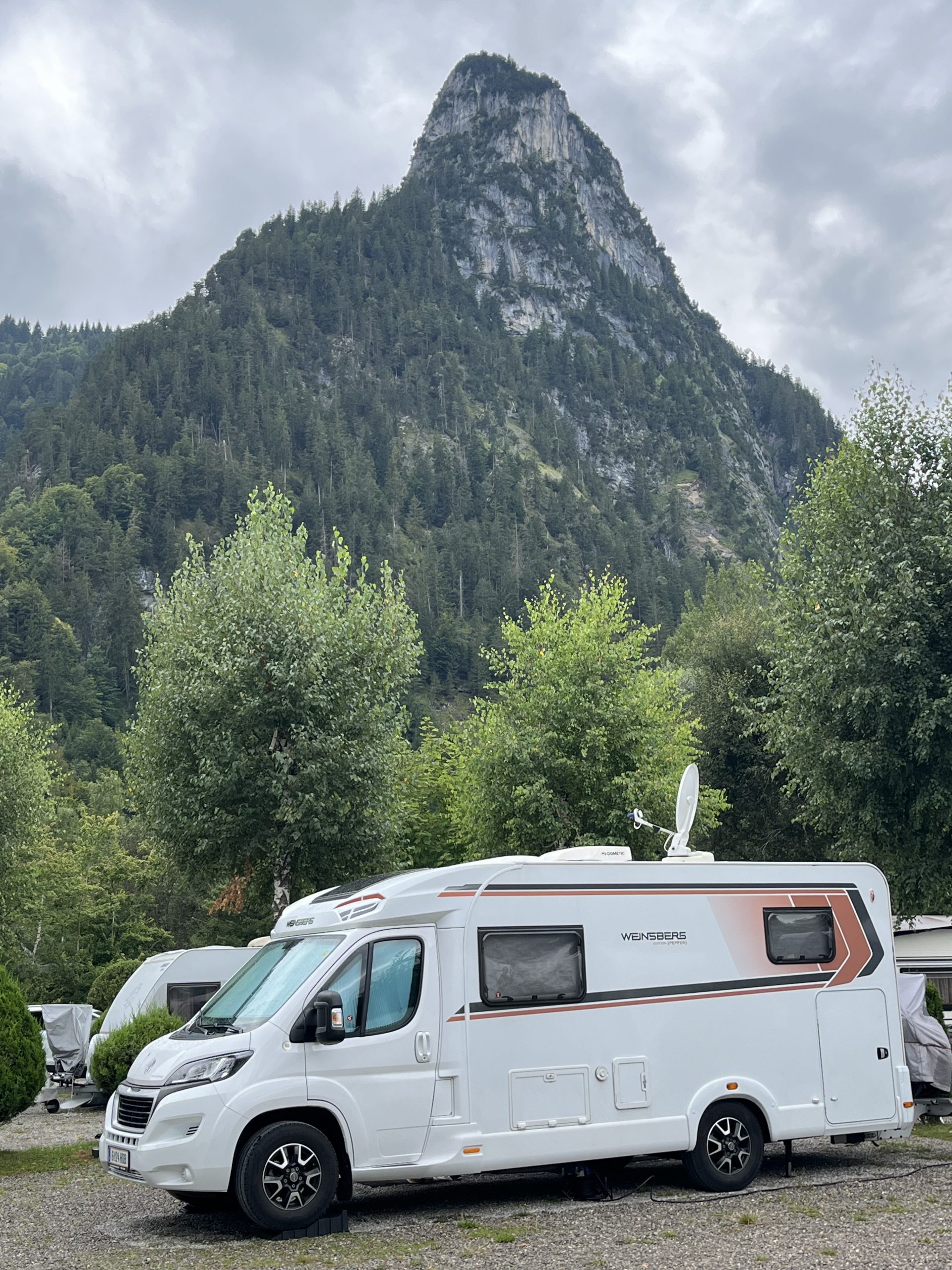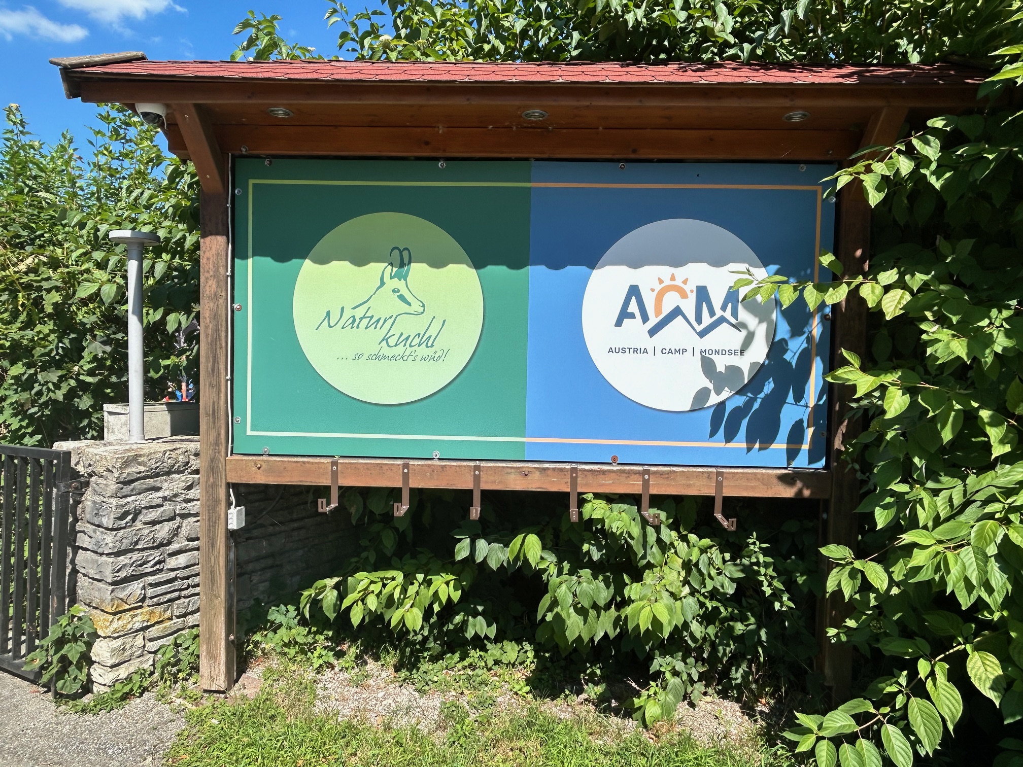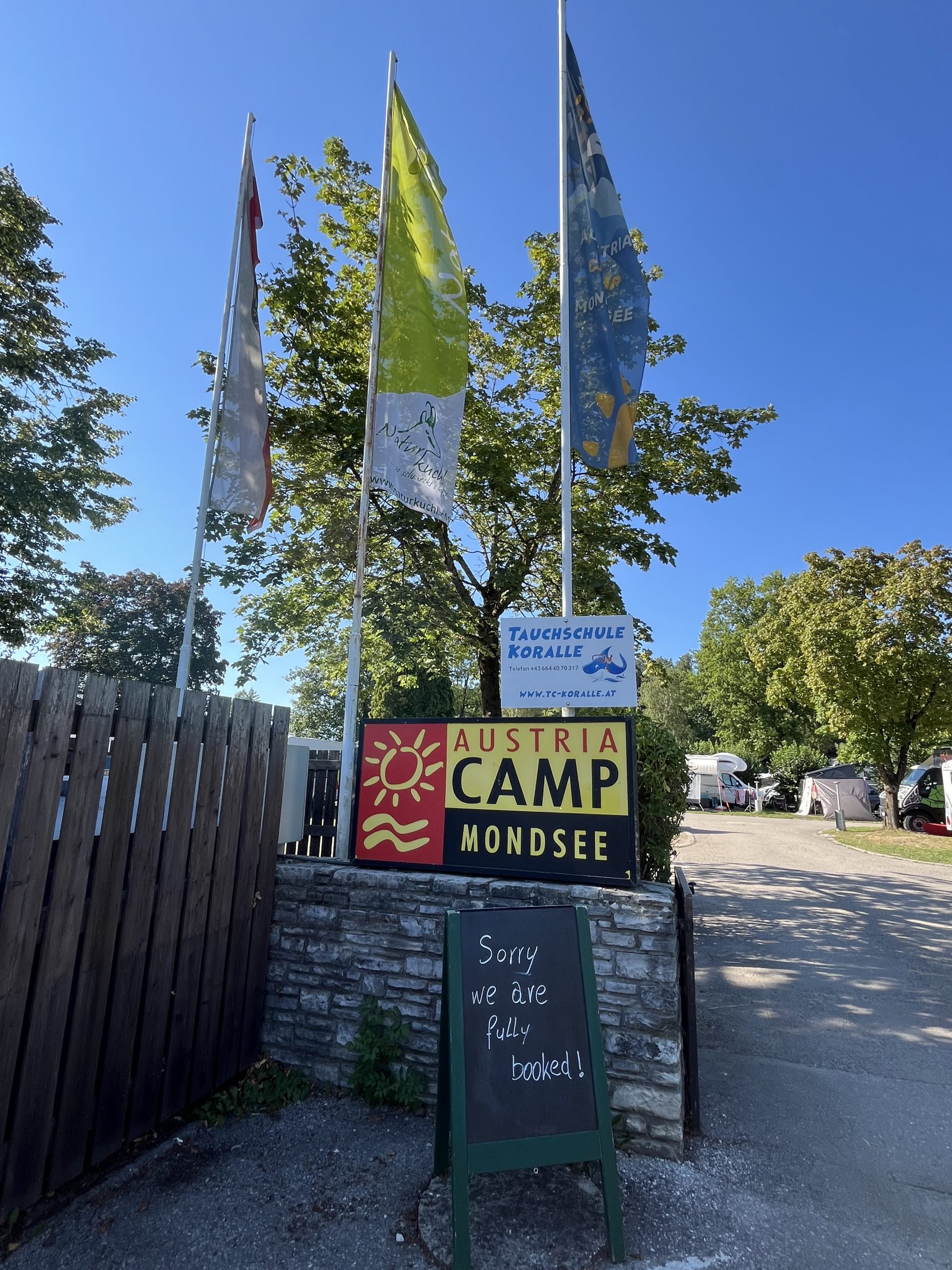 Wir buchten schon vor Wochen den wahrlich „letzten Stellplatz“ bei AustriaCamp in Sankt Lorenz am Mondsee. Wir fühlen uns generell im Salzkammergut sehr wohl und wollten diesmal einen anderen See, als den von uns bevorzugten Wolfgangsee und einen anderen Campingplatz kennenlernen. Der ca. 2 ha große und 110 Touristen-Stellplätze umfassende Campingplatz AustriaCamp ist der einzige direkt am Mondsee gelegene Platz und allein deswegen schon sehr beliebt. Wir wurden bei der Zufahrt nicht nur von der Tafel „Sorry we are full“, sondern auch bei der Rezeption von einem Kundenstopper „Mittagspause 1200 – 1400 Uhr“ begrüßt. Zum Glück hatten wir reserviert und nutzten die Wartezeit für einen Rundgang. Die Rezeption, das Restaurant und das Sanitärgebäude liegen sehr zentral und präsentierten sich in einem sehr guten Zustand. Die Sanitäreinrichtungen sind modern und ansprechend ausgestattet und durchwegs sauber. Wenn man eine Verunreinigung vorfand, so lag dies sicher nicht an einer versäumten Reinigung, sondern so wie in vielen Fällen, eher an der Nachlässigkeit („gehört eh nicht mir“) der Benützerinnen und Benützer. Die Bodenbeschaffenheit der Parzellen ist Gras und manchmal etwas uneben. Aber dafür gibt es ja Ausgleichskeile. Wie schon erwähnt befanden wir uns mitten in der Hauptsaison und dementsprechend gestaltete sich auch der Preis. Nachdem aufgrund der Auslastung eine Verlängerung nicht möglich war, zahlten wir für 2 Erwachsene und 2 Nächte inkl. Strom € 107,00.  Sicher nicht gerade günstig, aber das Preis- Leistungsverhältnis war für die Hauptsaison schon stimmig.