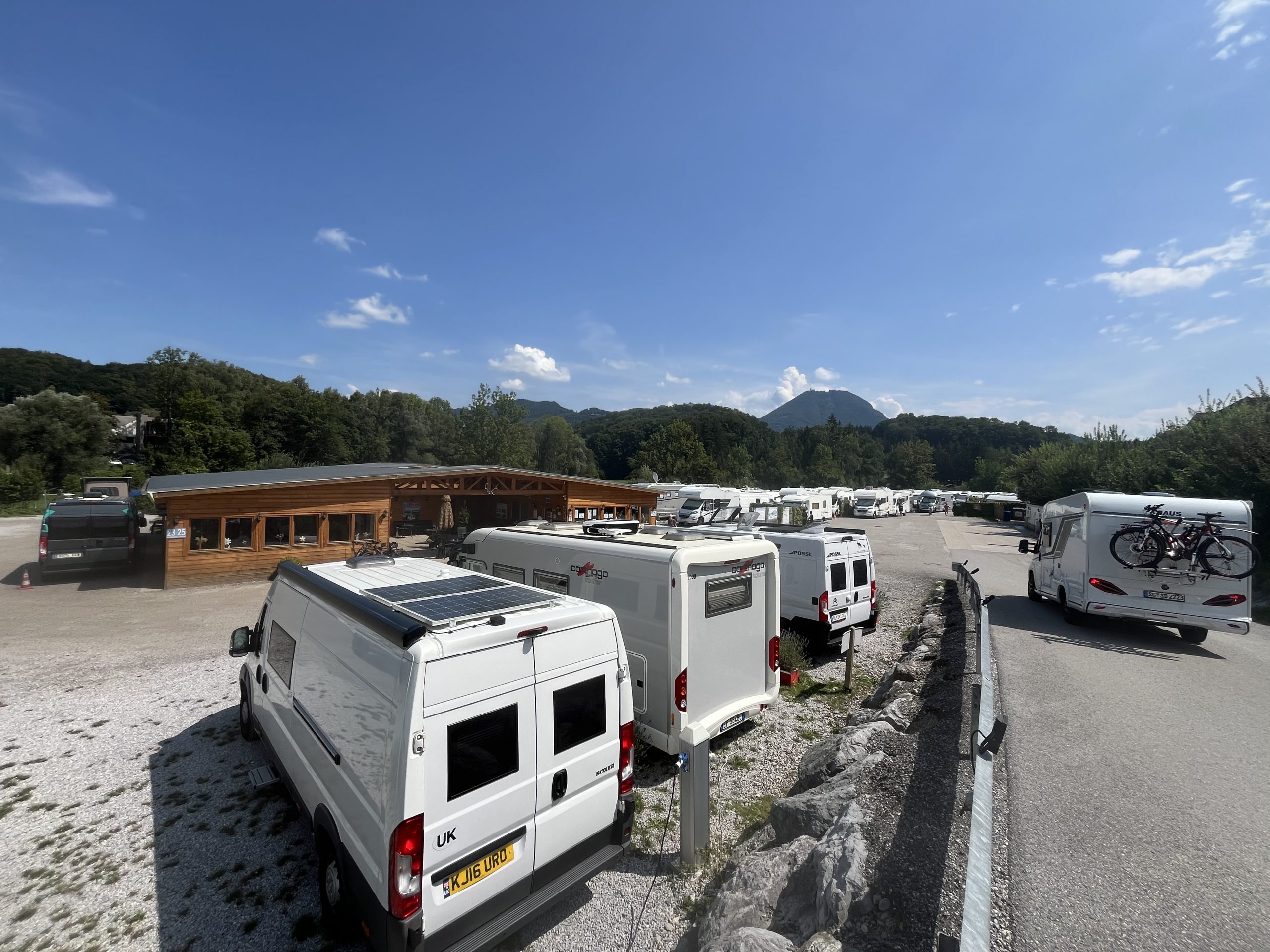 Auf der Homepage „Reisemobilstellplatz“ findet man nicht nur Salzburg, sondern hier findet man auch die Stellplätze Graz, Wien und Mureck. Der Empfang war trotz der hohen Auslastung überaus freundlich. Aufgrund unserer Anfrage und der frühen Anreise durften wir uns auch einen Stellplatz aussuchen. Die Parzellen sind zwar etwas eng, aber man findet auf der ebenen geschotterten Fläche ausreichend Platz. Auch die Servicestation (Chemie-WC und Grau- und Trinkwasser) ist so großzügig ausgelegt, dass mehrere Wohnmobile gleichzeitig diese nutzen können. Sanitäreinrichtungen sind ausreichend vorhanden und sauber. Die Modalitäten für die Abreise sind total unbürokratisch und fußen auf Vertrauen. Man(n) oder in unserem Fall, Frau, trägt auf dem Formular die tatsächliche Aufenthaltsdauer ein und legt das Geld (€ 33,50 all inklusive für eine Nacht und 2 Erwachsene) zusammen mit dem ausgefüllten Formular in die Klarsichtfolie und wirft diese in die „schwarze Box“ bei der Rezeption. „That´s it“.
