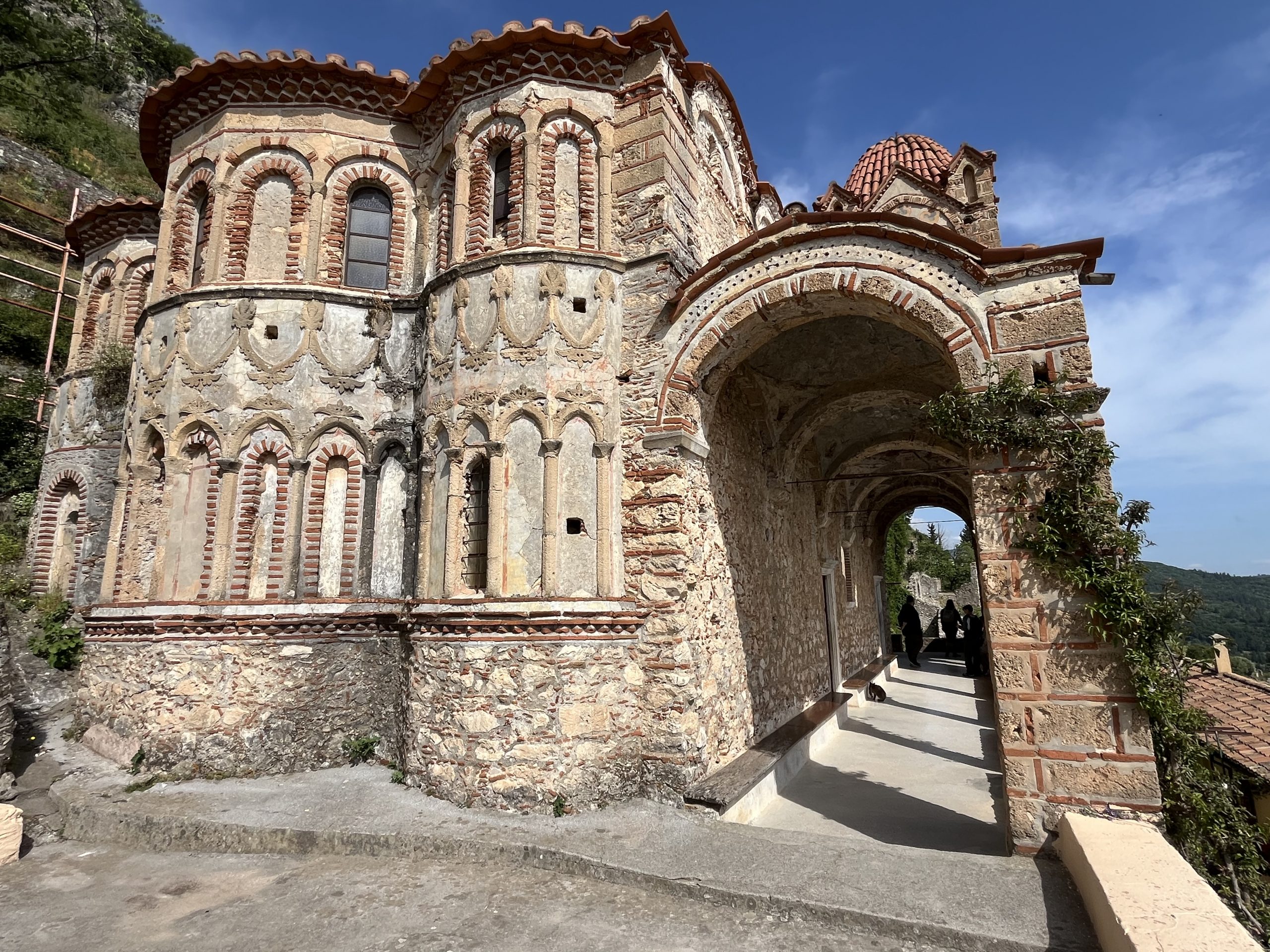 Auf dem Weg nach Mystras – unserem eigentlichen Zwischenziel – nahmen wir einen Umweg in Kauf. Wir verließen südlich von Lerna die B7 und fuhren entlang der faszinierenden Küstenstraße nach Astros. Von dort aus ging es nach Westen, wobei wir beim Kloster Moni Metamorphosen einen Zwischenstopp einlegten. Nach einem kurzen Einblick in die spirituelle Geschichte der Region ging es über Serpentinen weiter Richtung Mystras.