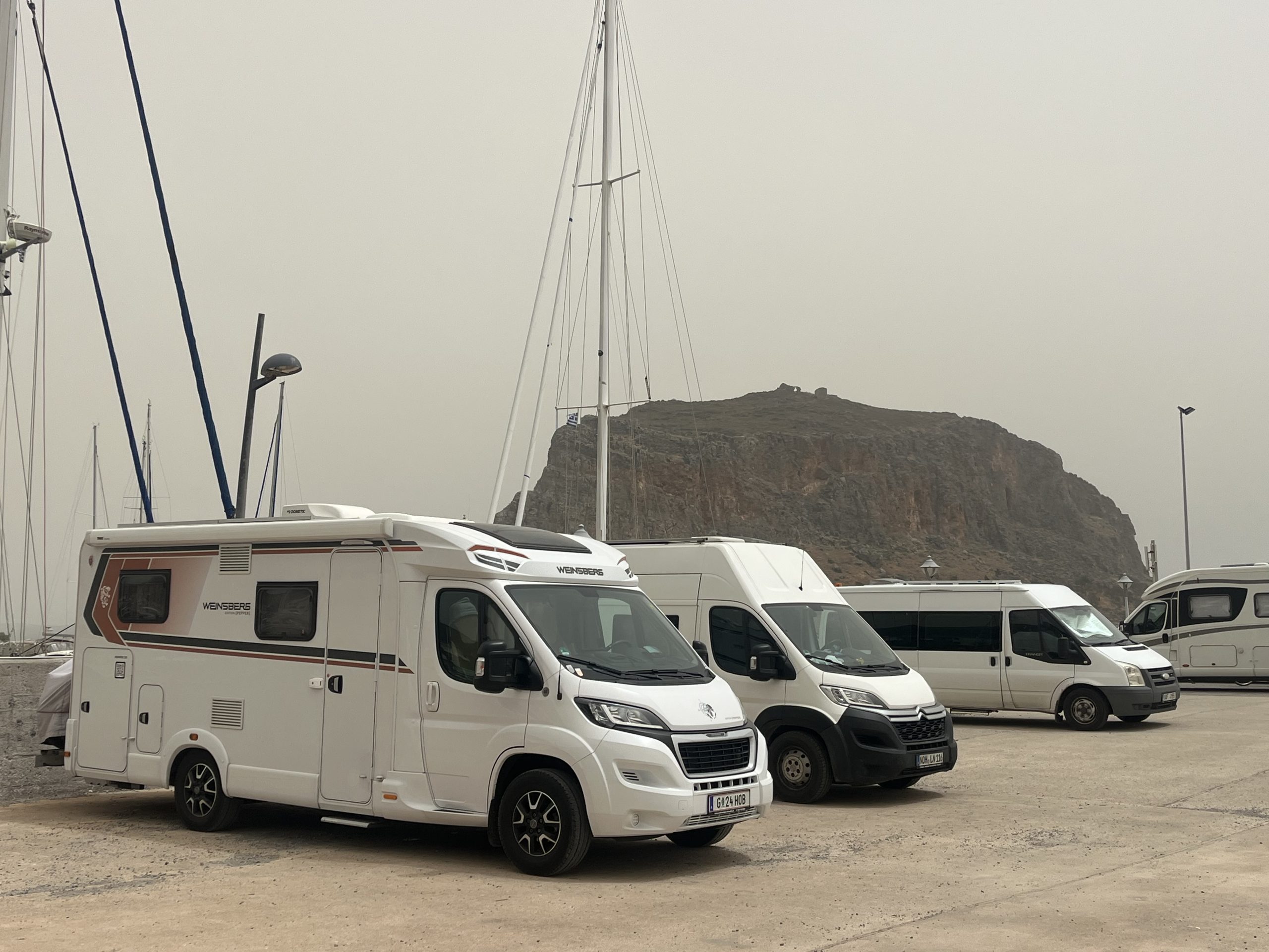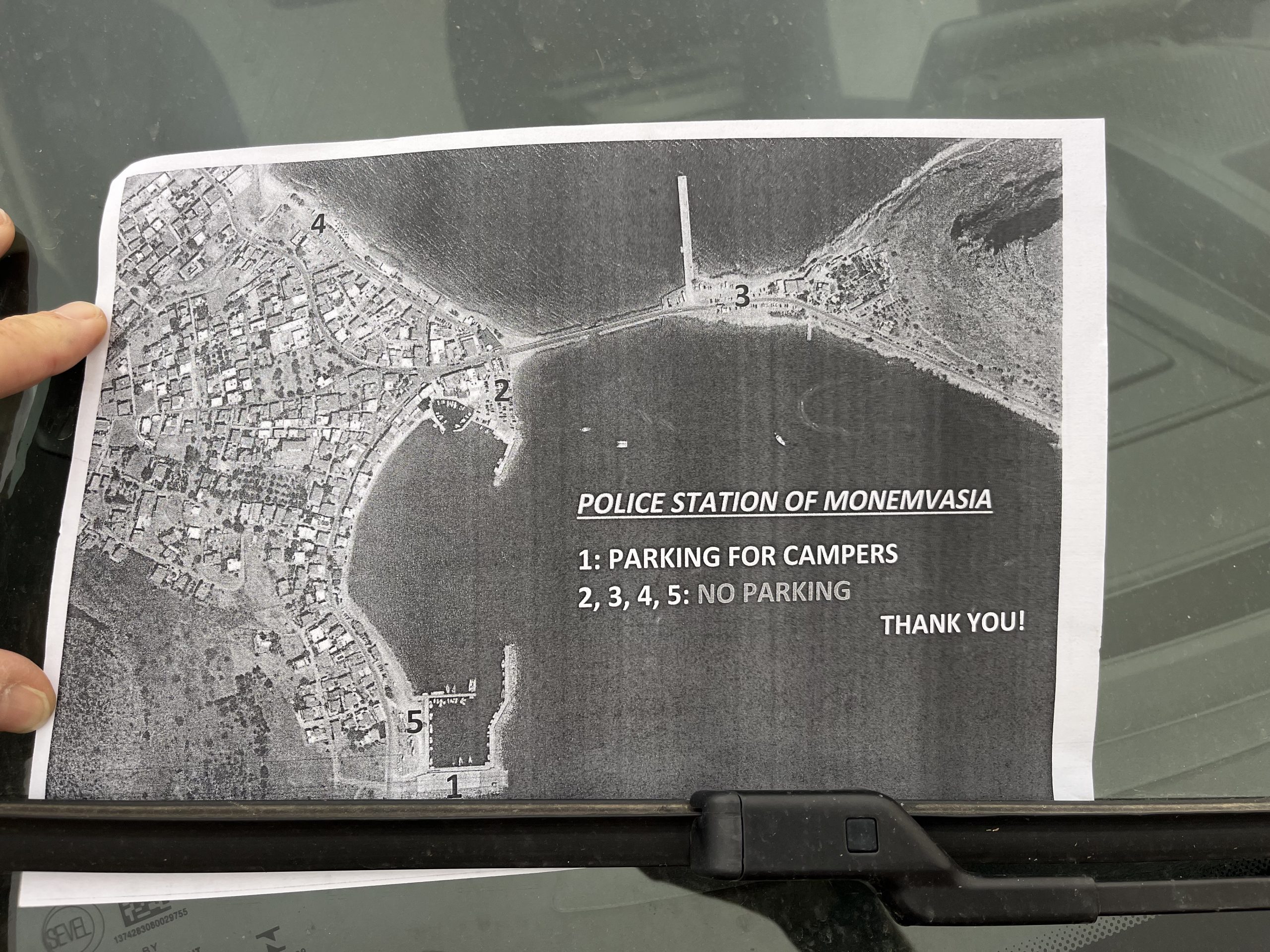 Obwohl es in Monemvasia wie schon erwähnt keine ausgewiesenen Stellplätze gibt, lohnt sich ein Aufenthalt von einer Nacht. Achtung: Es gitb direkt am Jachthafen einen mit betonierten Untergrund auch von der Polizei akzeptierten Stellplatz. Alle anderen Parkmöglichkeiten sind für Wohnmobile tabu und werden von der Polizei nicht akzeptiert. Bitte zeigt auch kein Campingverhalten. Tische und Sessel sollten verpackt bleiben. Es gibt seit Jänner 2025 in Griechenland eine gültige Gesetzeslage, die man gerade als Gast zu akzeptieren hat. Die Polizei zeigt sich zurzeit überaus kooperativ. Selbst, nachdem der vorgesehene Stellplatz aufgrund des starken Wellenganges überschwemmt wurde und unsere Fahrzeuge bis zur Unterkante unter Wasser standen, hat uns die Polizei einen Ausweichstellplatz zugewiesen.