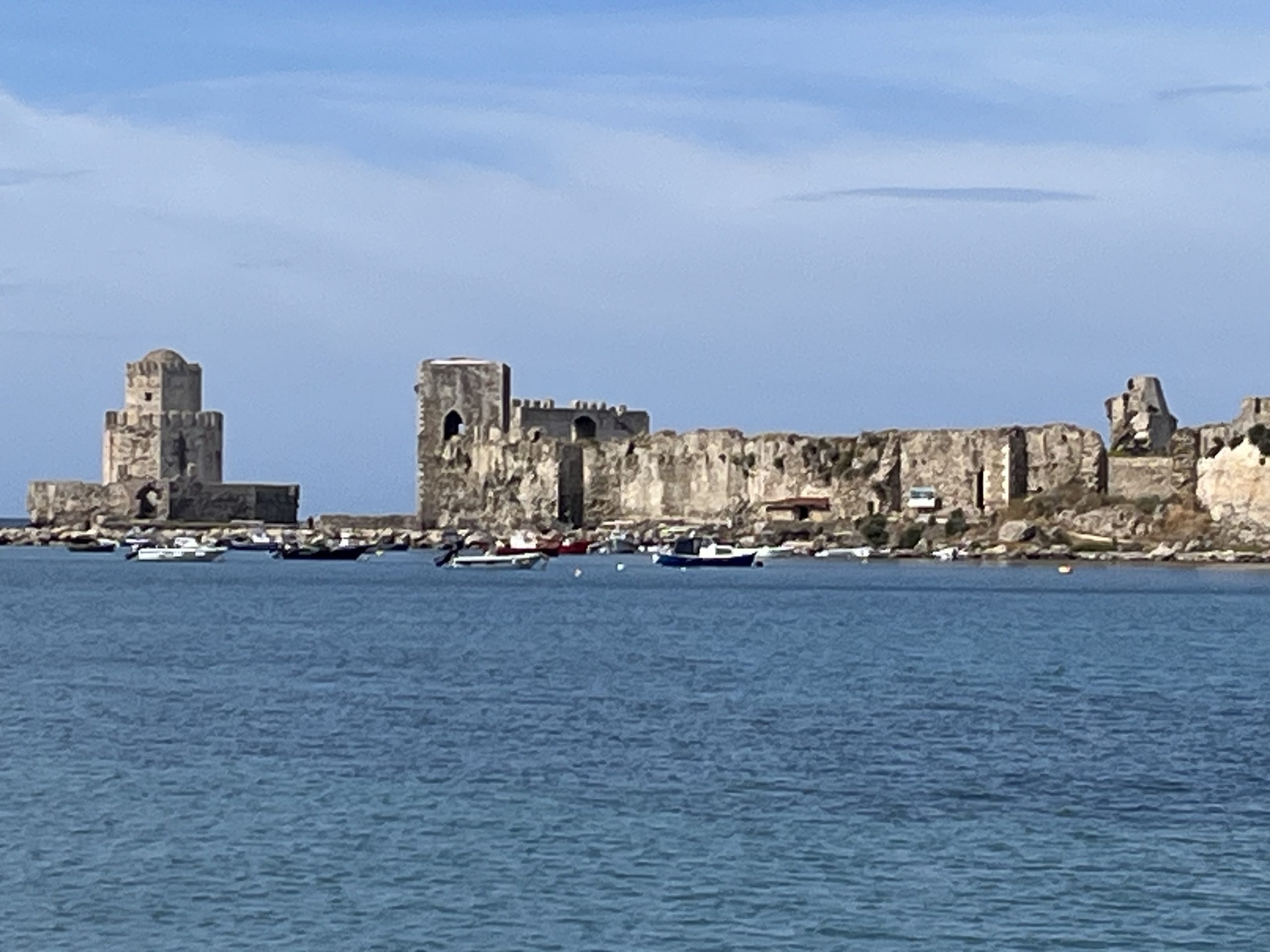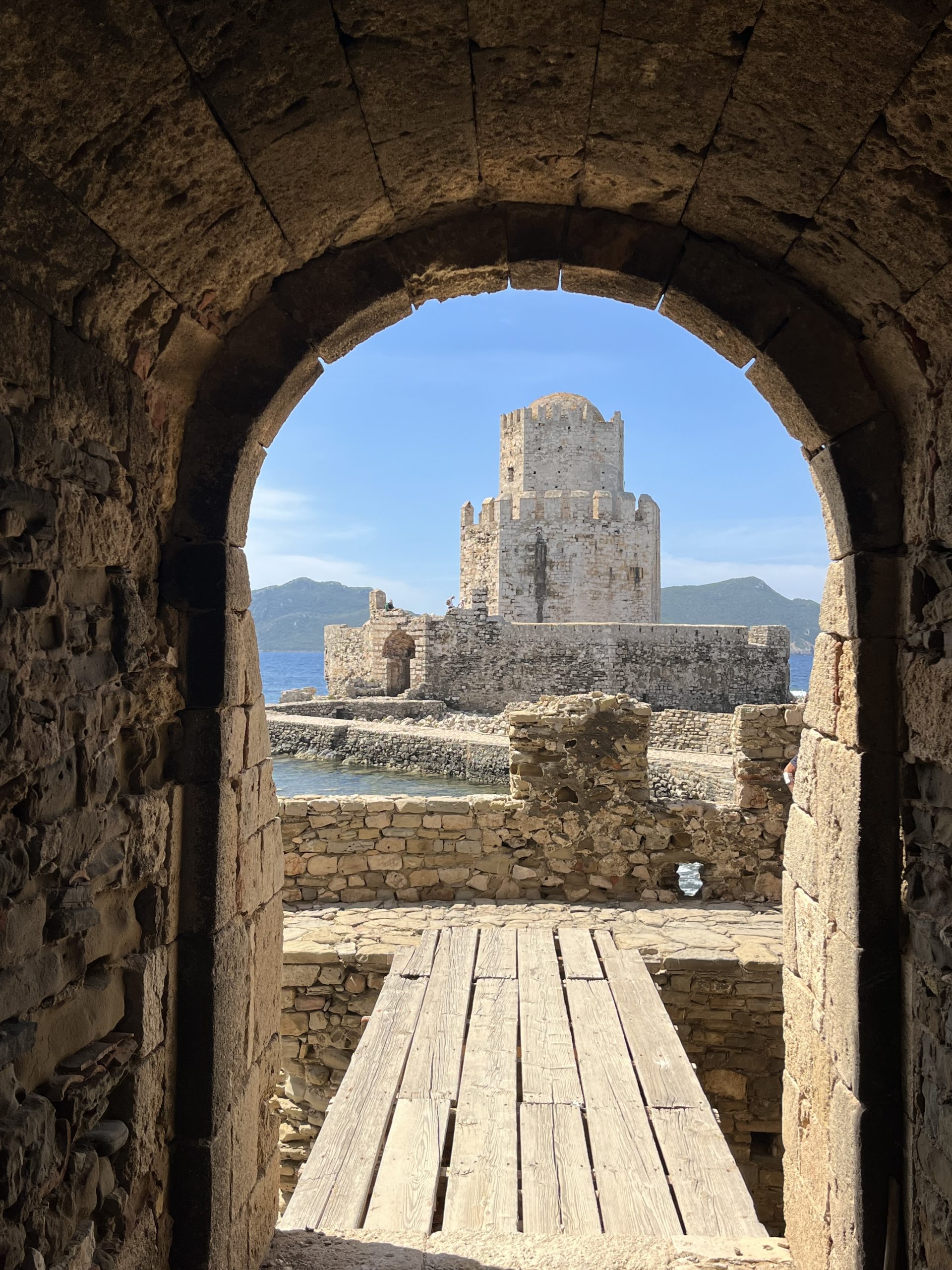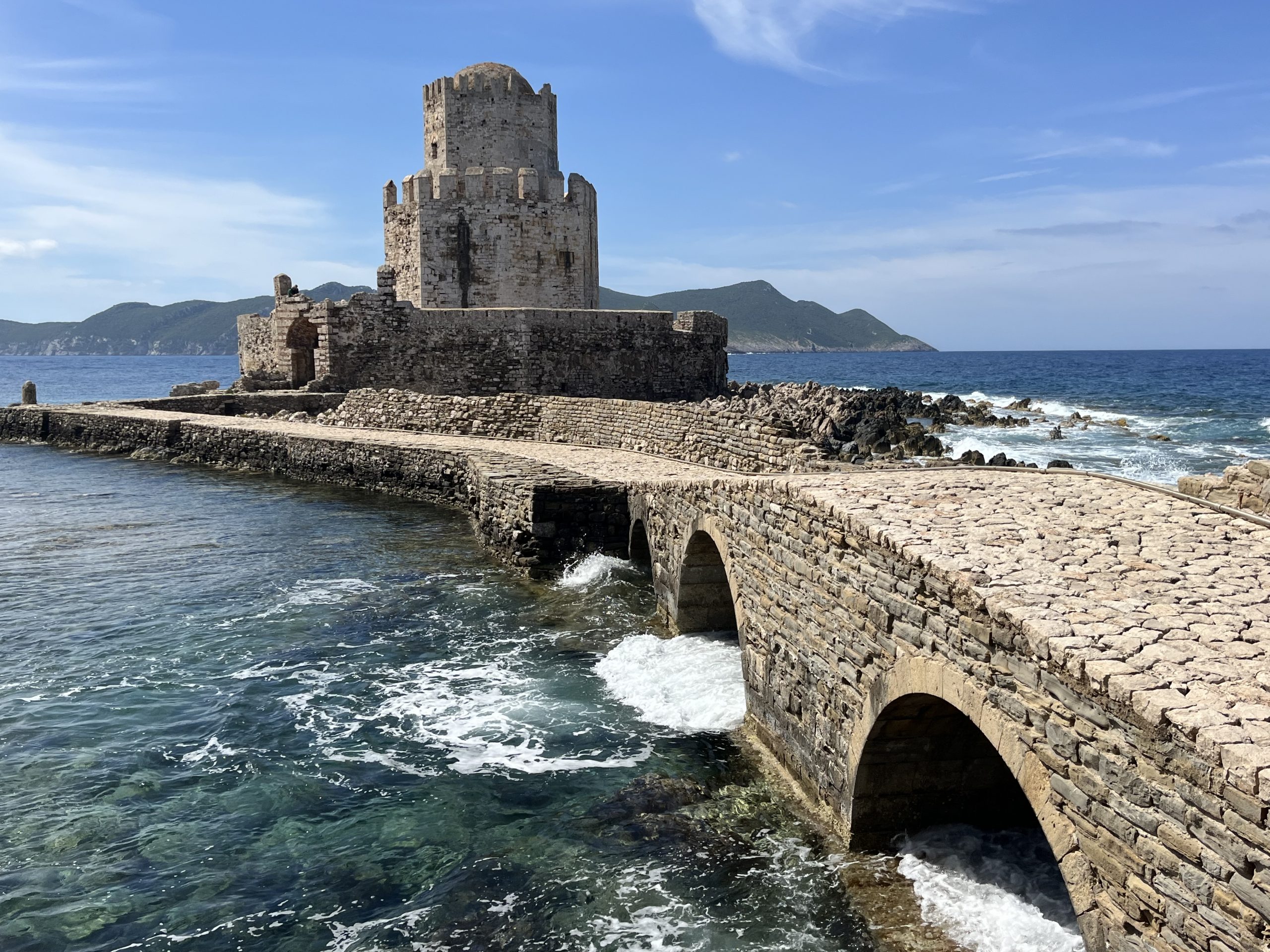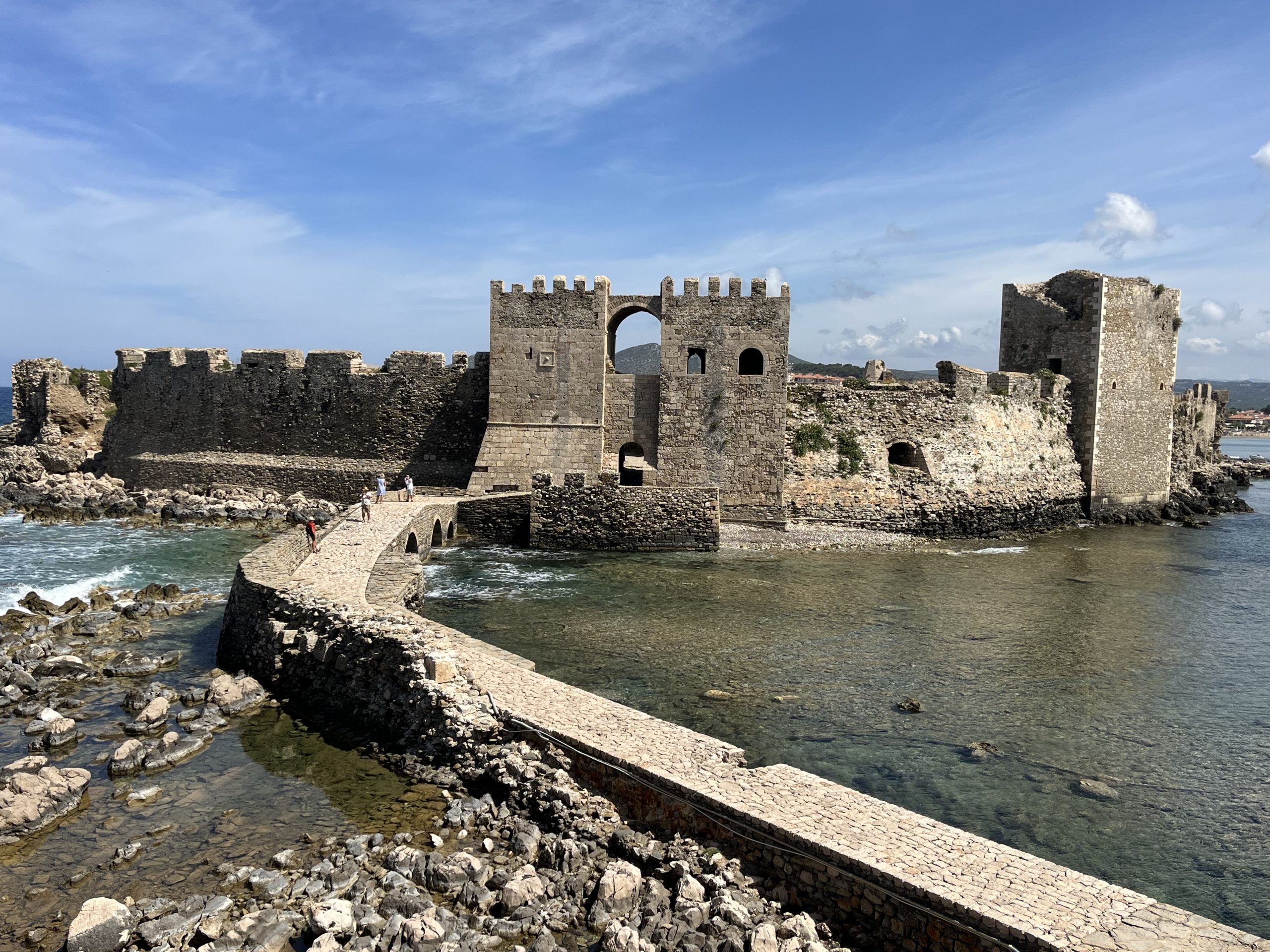 Unsere Rundreise wäre nicht komplett ohne einen Abstecher in die reiche Geschichte des Peloponnes. Die Festung Methoni war ein absolutes Muss auf unserer Reiseroute. Diese beeindruckende venezianische Festung, die majestätisch auf einer Halbinsel ins Meer ragt, ist ein wahrhaftes architektonisches Meisterwerk. Wir verbrachten Stunden damit, die weitläufigen Mauern, Türme und den einzigartigen „Bourtzi“-Turm, der auf einer kleinen Insel vor der Festung liegt, zu erkunden. Der Anblick dieser historischen Stätte vor der Kulisse des azurblauen Mittelmeers war einfach unvergesslich. Unser Campingplatz „Camping Thines“, nahe Finikounda, war der ideale Ausgangspunkt um die Festung Methoni mit den Fahrrädern zu erreichen.